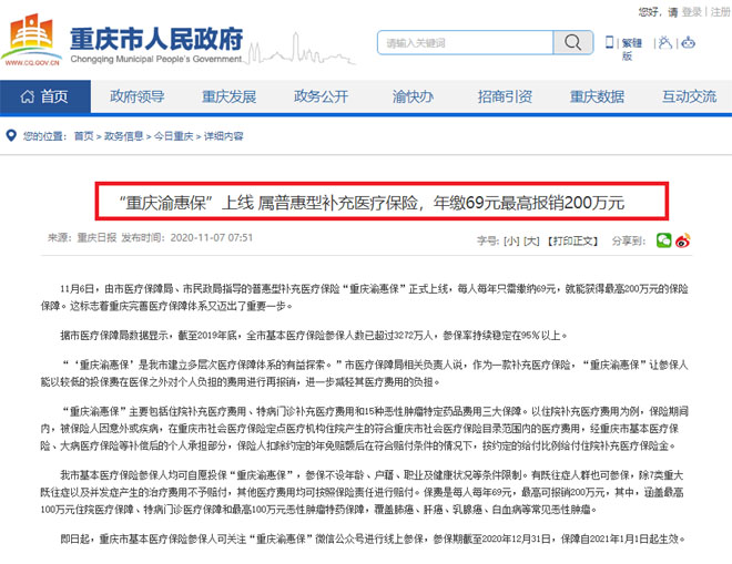 即日起到2020年12月31日,符合條件的重慶市社會(huì)基本醫(yī)療保險(xiǎn)參保人均可通過指定平臺“重慶渝惠?!蔽⑿殴娞柧€上辦理參保。