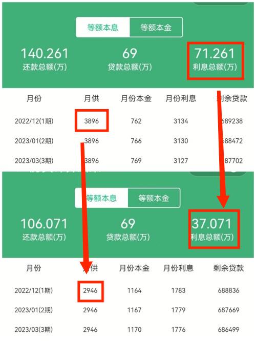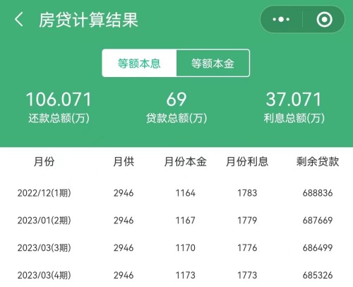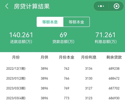 從上兩張圖可以看到,房貸本金69萬(wàn),一共需要還71.261萬(wàn)利息;總共是140.261萬(wàn)。